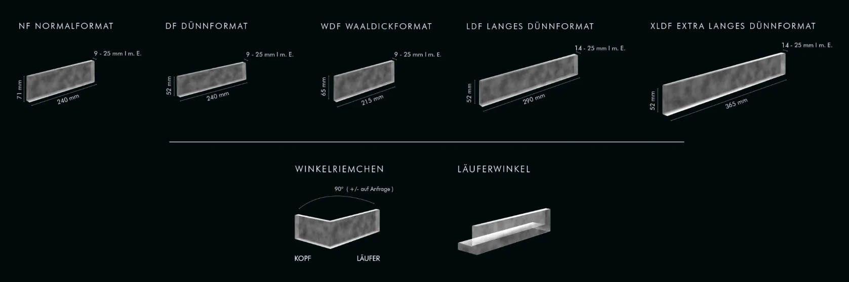 Steenstrips zijn robuuste keramische producten, vervaardigd uit natuurlijke grondstoffen en gebakken bij ongeveer 1.150 °C. In tegenstelling tot conventionele varianten worden de strippen bij Feldhaus direct op de gewenste maat geproduceerd: geen zaagwerk, geen afval.